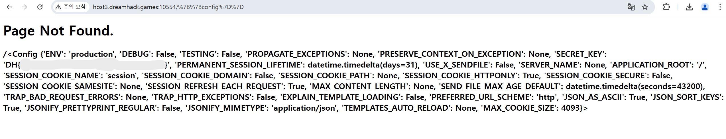 404Error 페이지에 들어왔는데 이렇게 뜨길래 Jinja Template에서 자주 쓰이는 공격 페이로드 중 {{config}}를 사용해본다.
