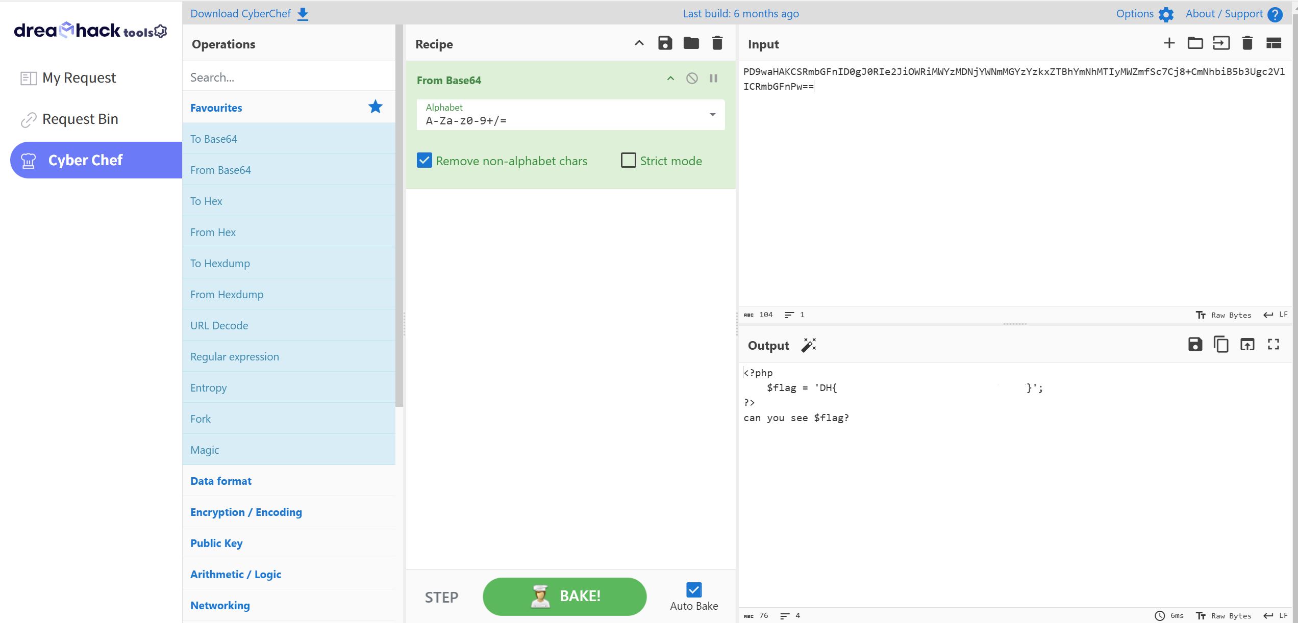 드림핵 cyberchef 페이지에 base64 decode로 붙여넣으면 플래그값을 얻을 수 있다.