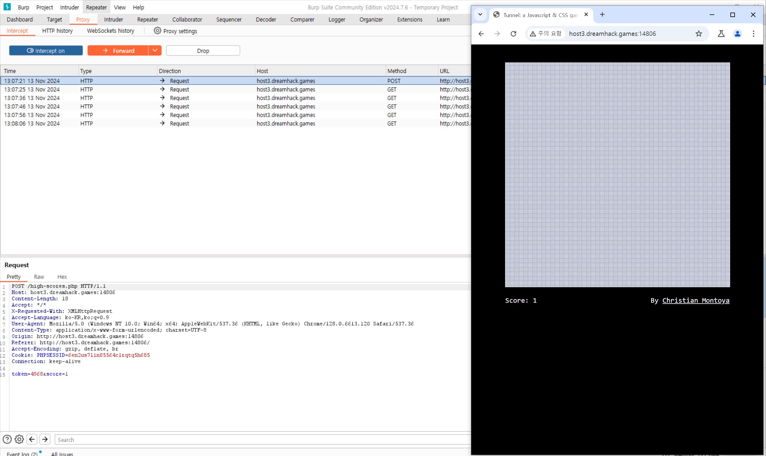 위는 burpsuite로 문제 환경에 접속한 후 게임이 종료되는 순간의 모습이다.
