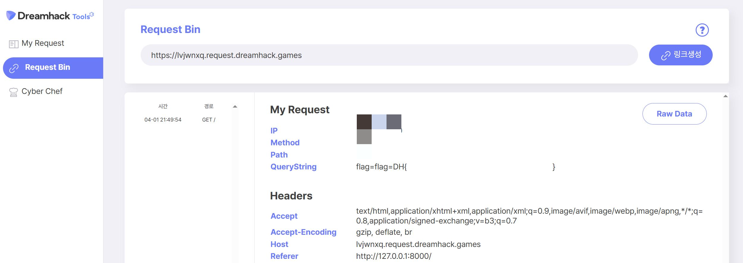 위 코드에 드림핵에서 제공하는 request bin 원격 서버 주소로 바꾸고 사용하면 된다.
