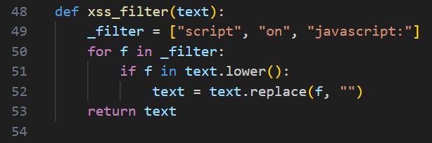 문제 파일을 다운로드 받고 app.py를 열어보았는데 주목해야 하는 부분은 위의 xss_filter 함수이다.