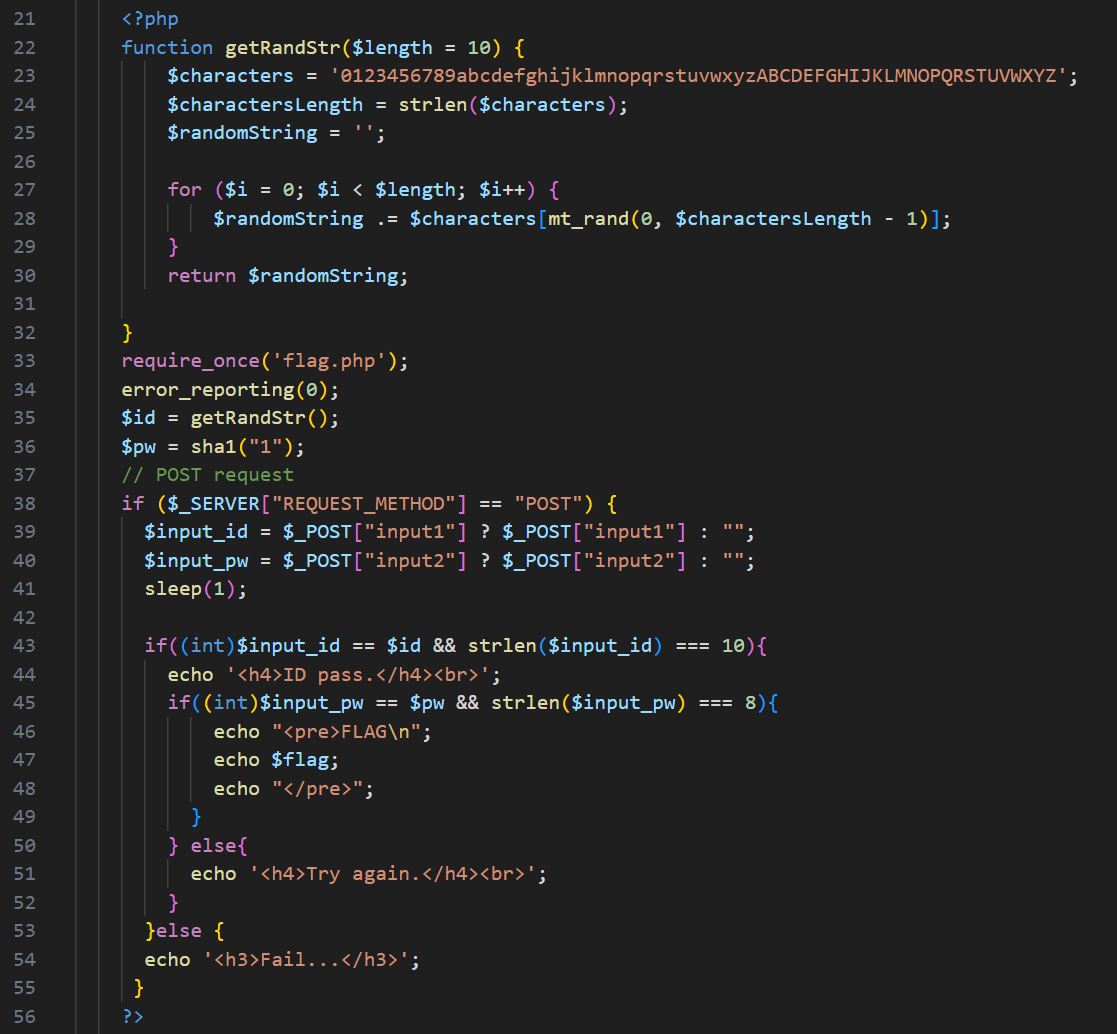 반면 id는 랜덤 문자열 10자리인데, 자세히 보면 (int)$input_id == $id 이 조건문에서 input_id를 가져와 int 형변환을 해주고 있는 것을 볼 수 있다.