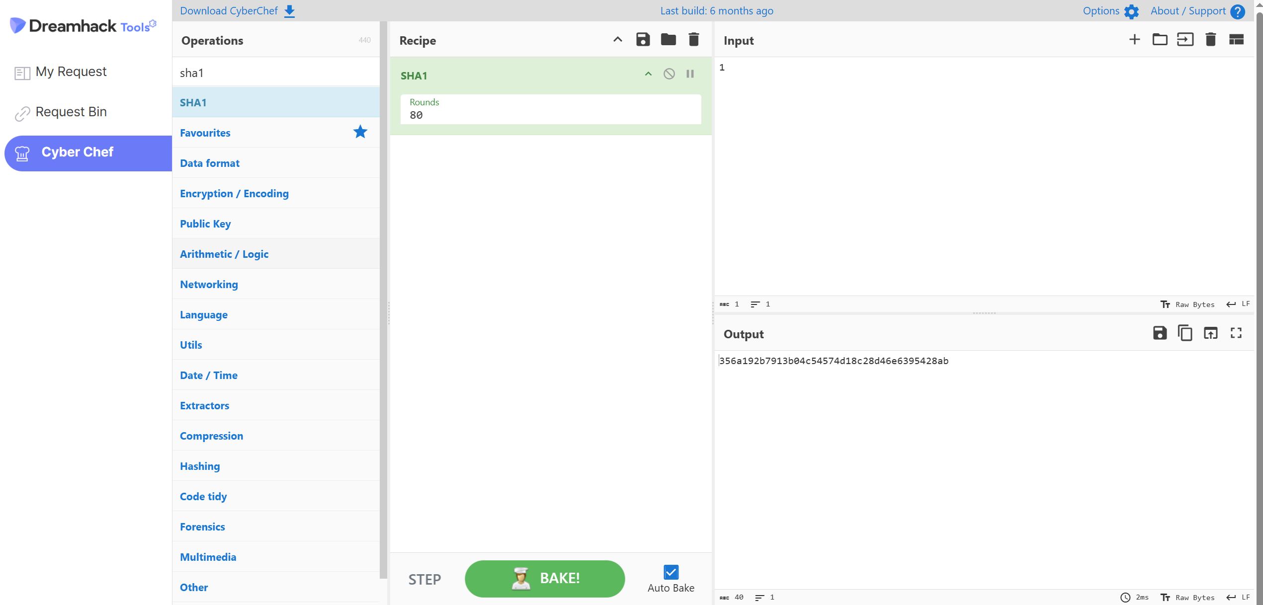 dreamhack cyberchef 페이지에서 1을 sha1으로 암호화한 결과값은 위와 같다.
