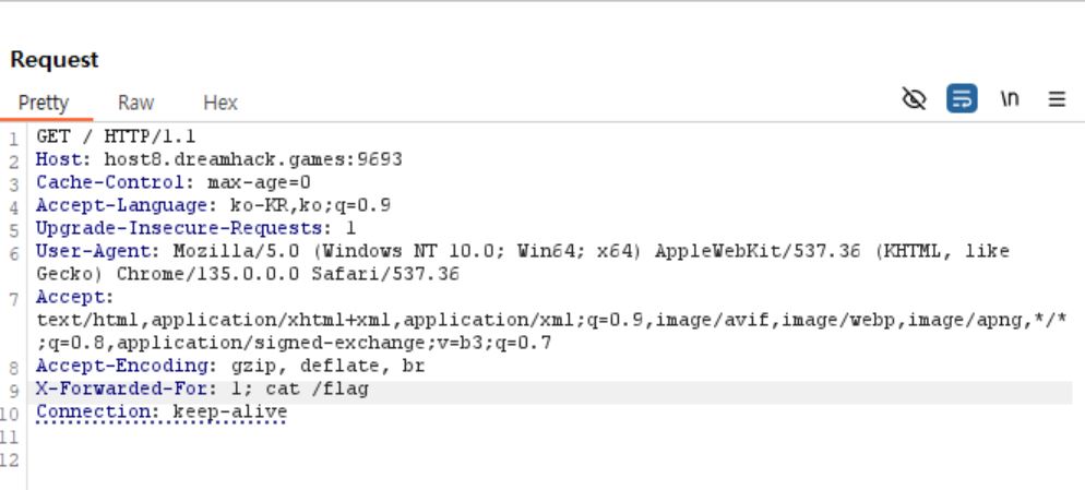 앞서 살펴봤듯 request.access_route에서 클라이언트 IP 목록의 1번째 요소를 변수 user_ip에 저장하니까, 위와 같이 Burp Suite에서 X-Forwarded-For 헤더를 추가해 1; cat /flag를 넣으면 플래그값을 얻을 수 있을 것이다.