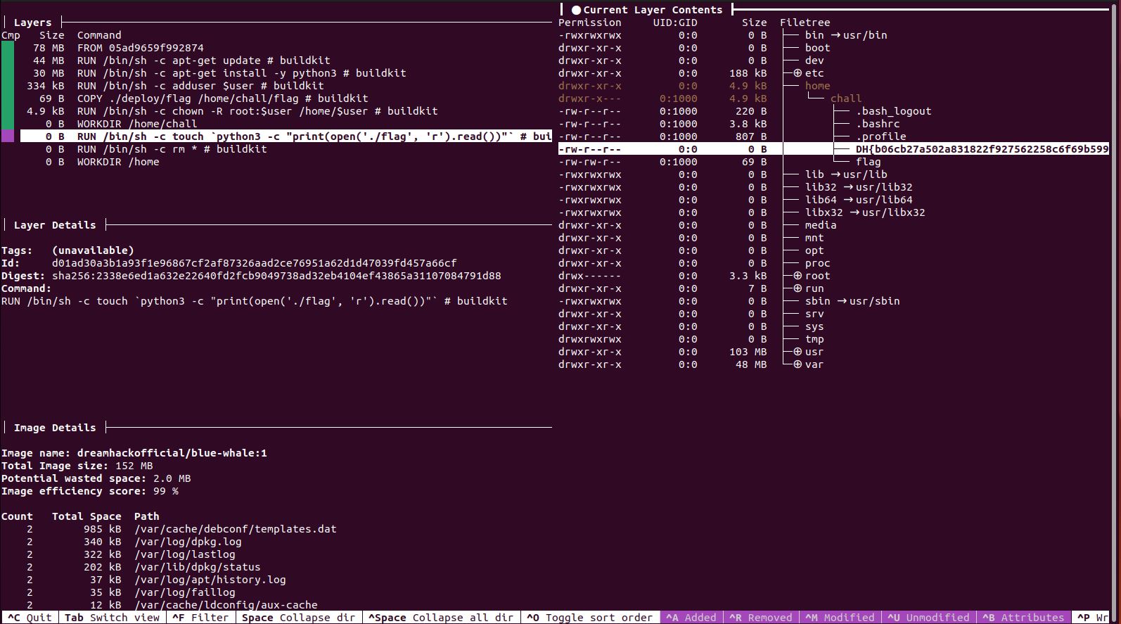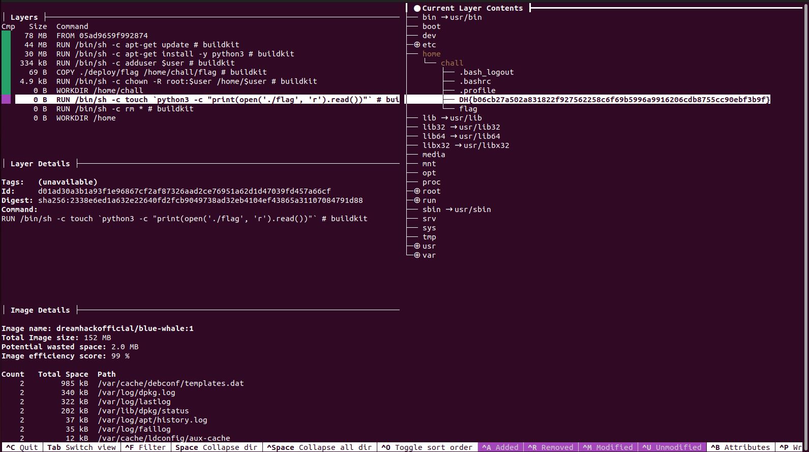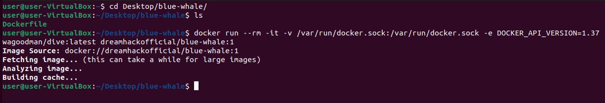 그 코드를 그대로 치되, dive arguments 자리에는 문제에서 제시한 도커 이미지인 dreamhackofficial/blue-whale:1 를 넣어준다.