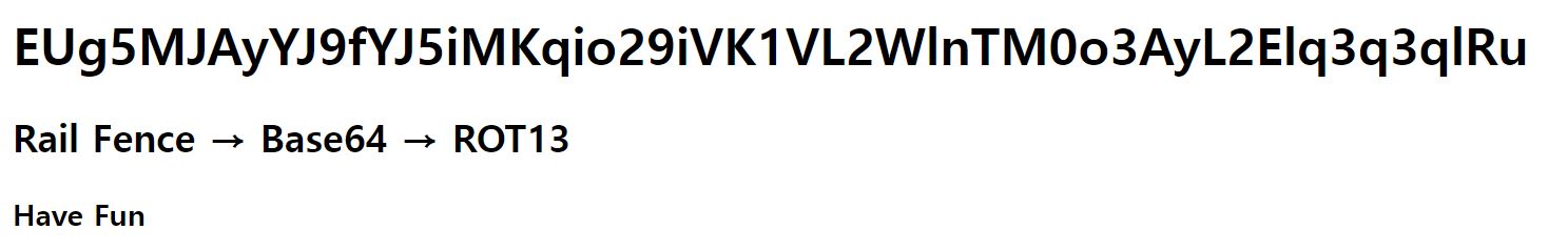 첫 줄 아래에 적힌 걸 보아, 플래그값을 Rail Fence → Base64 → ROT13 순서대로 암호화를 하여 저러한 문자열이 된 것 같다.