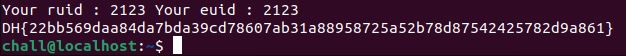 다시 ./chall flag를 입력해 실행하고 방금 얻은 걸 참고해서 ruid에는 1000, euid에는 2123 각각 넣어주기