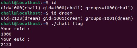 문제에서 dream 유저의 권한으로 "flag"파일을 읽으라고 했으니까 id dream을 통해 dream의 uid를 살펴보았다.