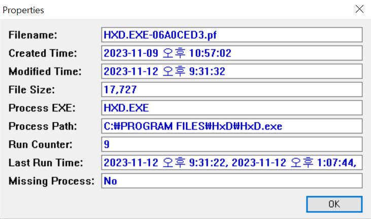 - WinPrefetchView 도구 이용하여 분석 (https://www.nirsoft.net/utils/win_prefetch_view.html)