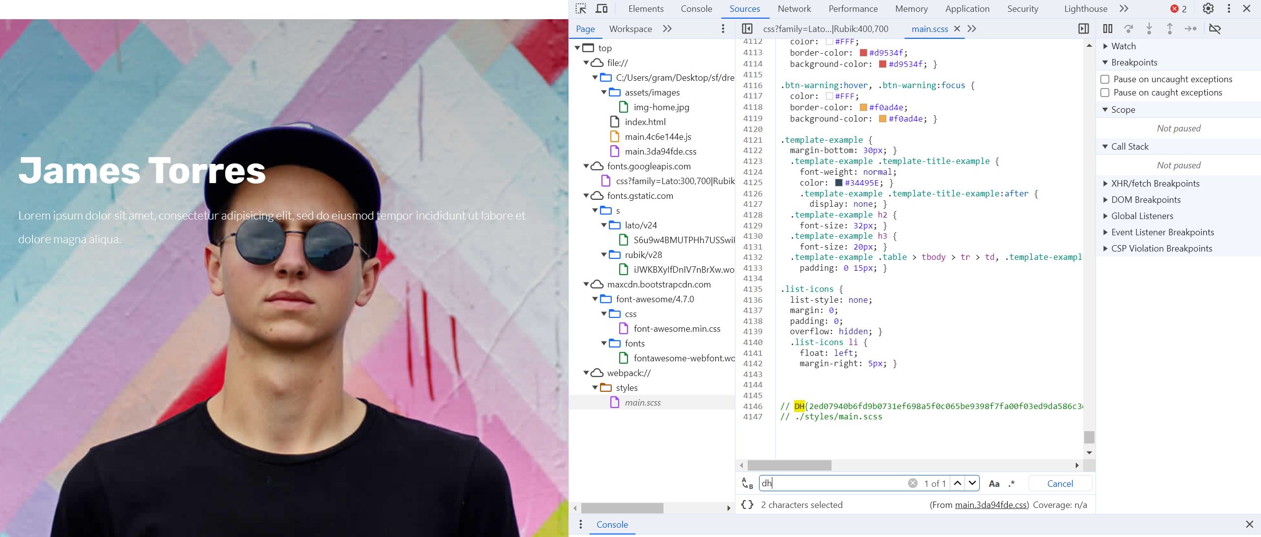 제일 아래에 있는 webpack:// 밑 styles 밑 main.scss에서 찾았다.