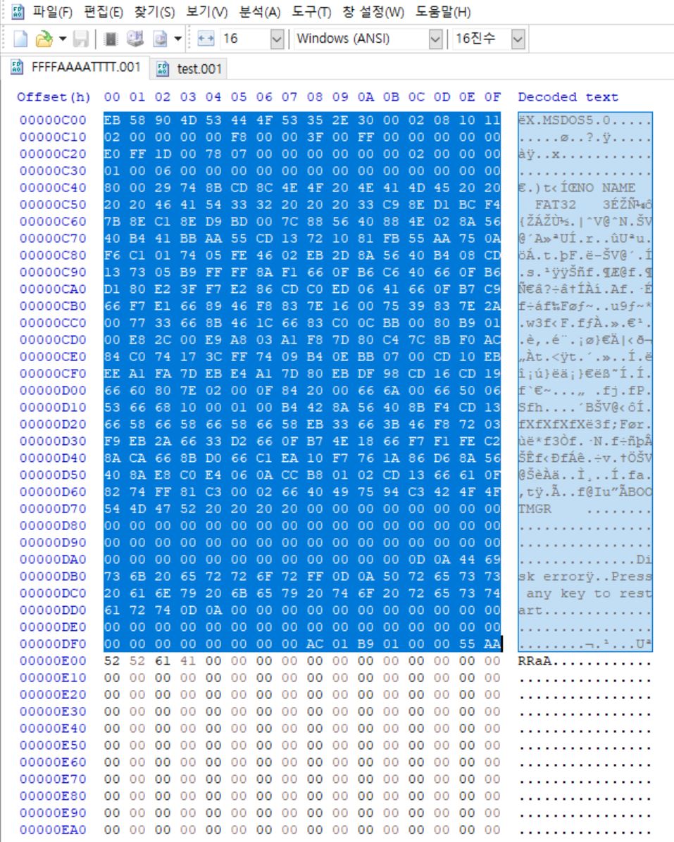가장 먼저 HxD로 열어보면 위와 같이 섹터 0부분에 Fix the Disk!!!!가 반복해서 나와있는데 이거 때문에 FTK Imager에서 정상 인식이 불가능한 줄은 몰랐다. 포렌식 워게임 풀어보기 시작한지 얼마 되지도 않았고 디스크 헤더 손상된 CTF 문제도 아직 풀어본 적이 없어서다. FTK Imager에서 파일시스템을 인식하지 못할 경우, 대부분 부트레코드의 변조나 손상때문이라고 한다.