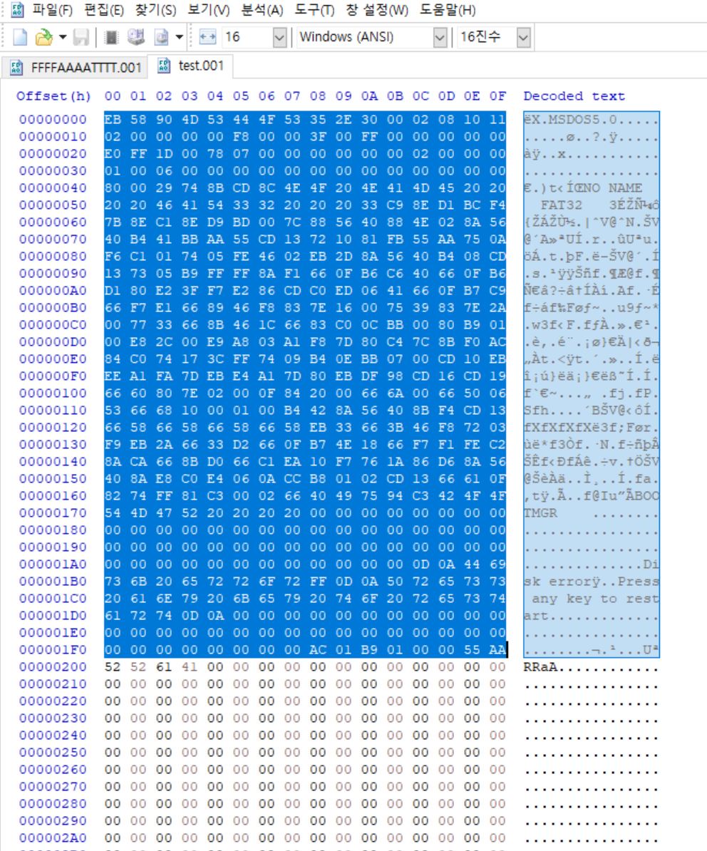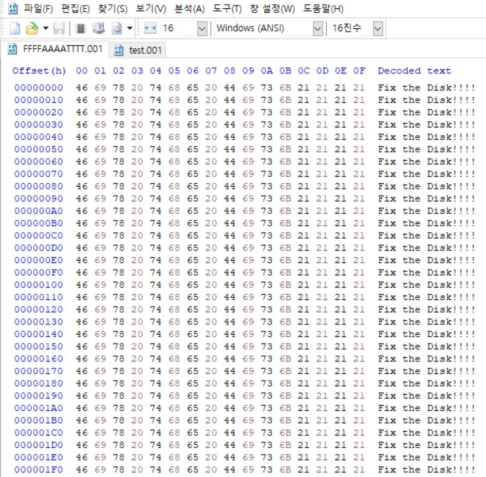위에 드래그한 섹터 0 부분에 붙여넣는다.(원래의 Fix the Disk!!!!를 덮어쓰는 과정)
