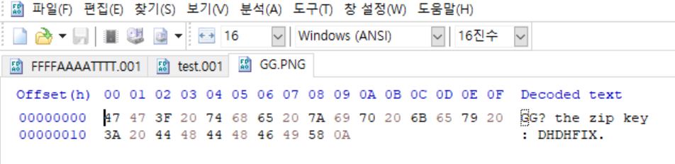 HxD로 GG.PNG를 열어보니 zip key가 DHDHFIX인 것을 알려준다.