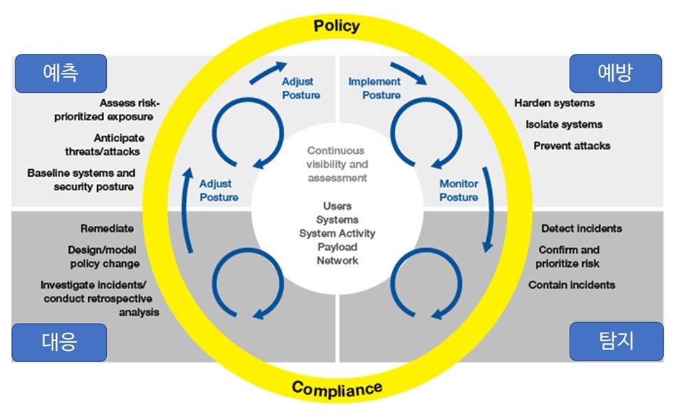 적응형 보안 아키텍처 ⓒ 가트너 사이트(2017) 보안에서 많이 사용하는 '예방 → 탐지 → 대응'의 보안 프로세스에서 '예방' 앞에 '예측'을 더 붙인 그림