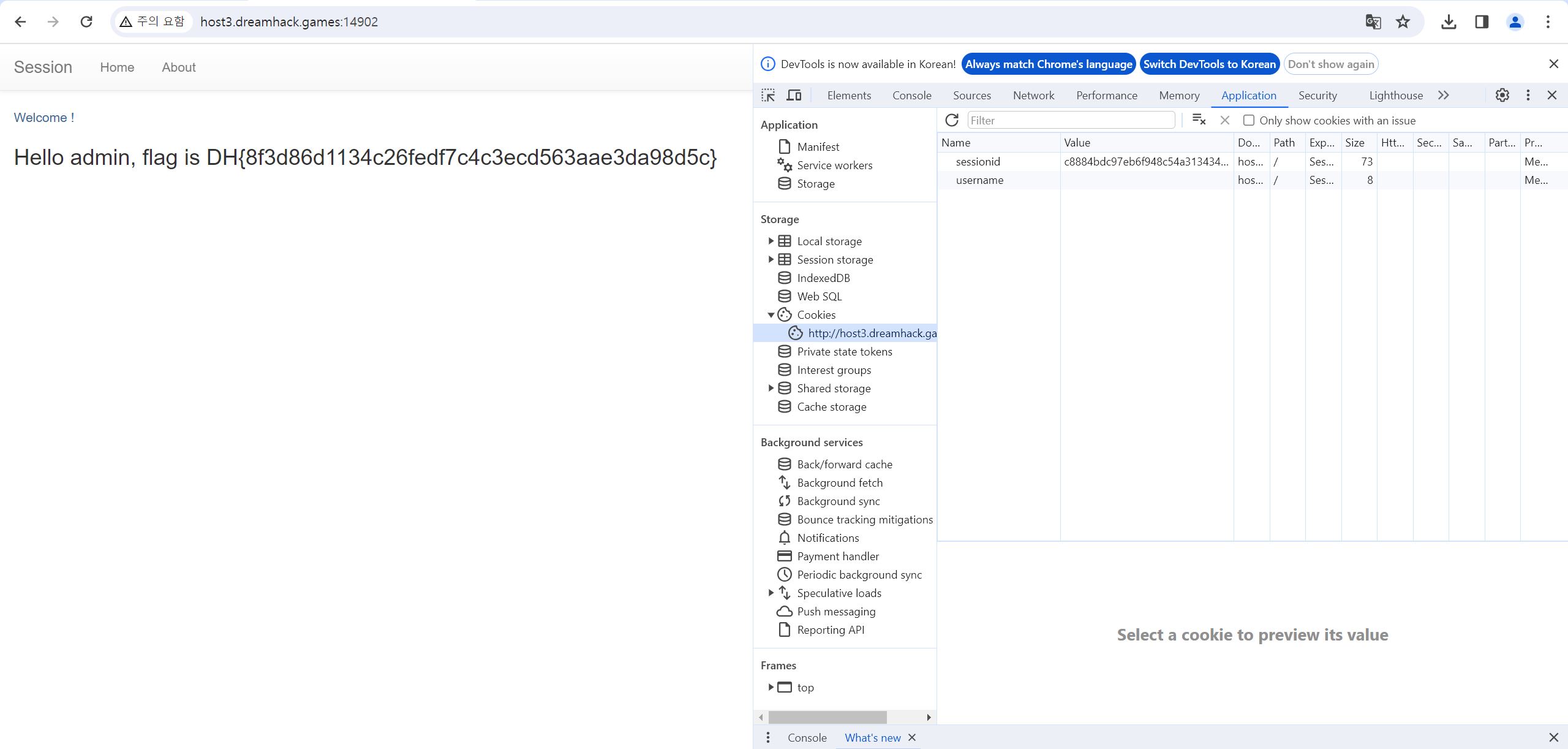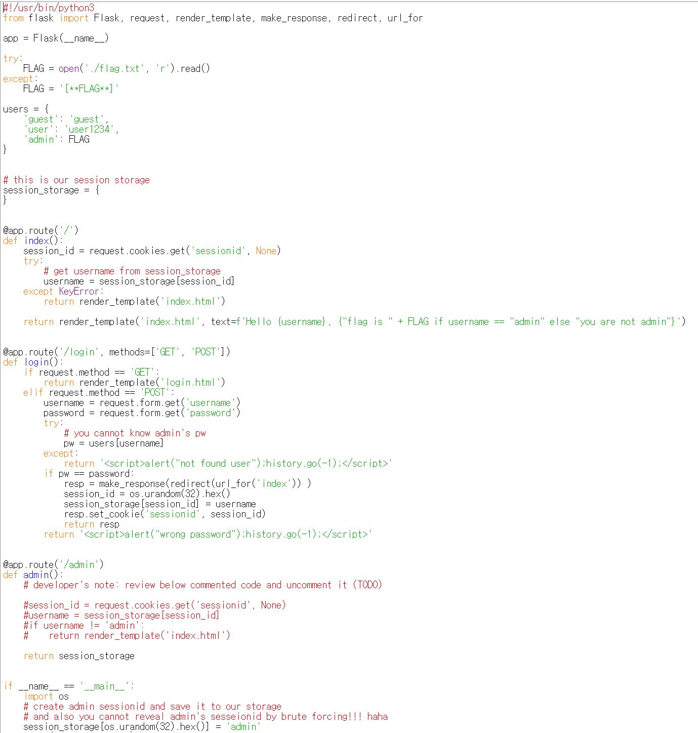 이 문제는 쿠키와 세션으로 인증 상태를 관리하는 간단한 로그인 서비스이며, admin 계정으로 로그인에 성공하면 플래그를 획득할 수 있다.