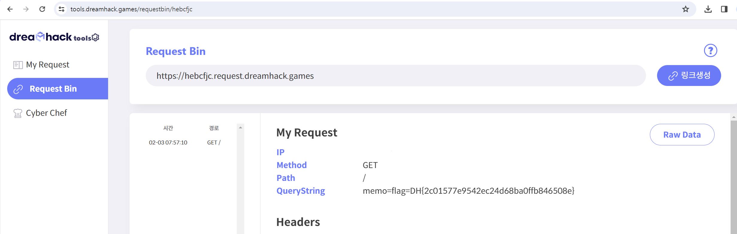 드림핵 툴즈 서비스(tools.dreamhack.games)에서 Request Bin 기능은 이용자의 접속 기록을 저장하기 때문에 해당 정보를 확인할 수 있다.