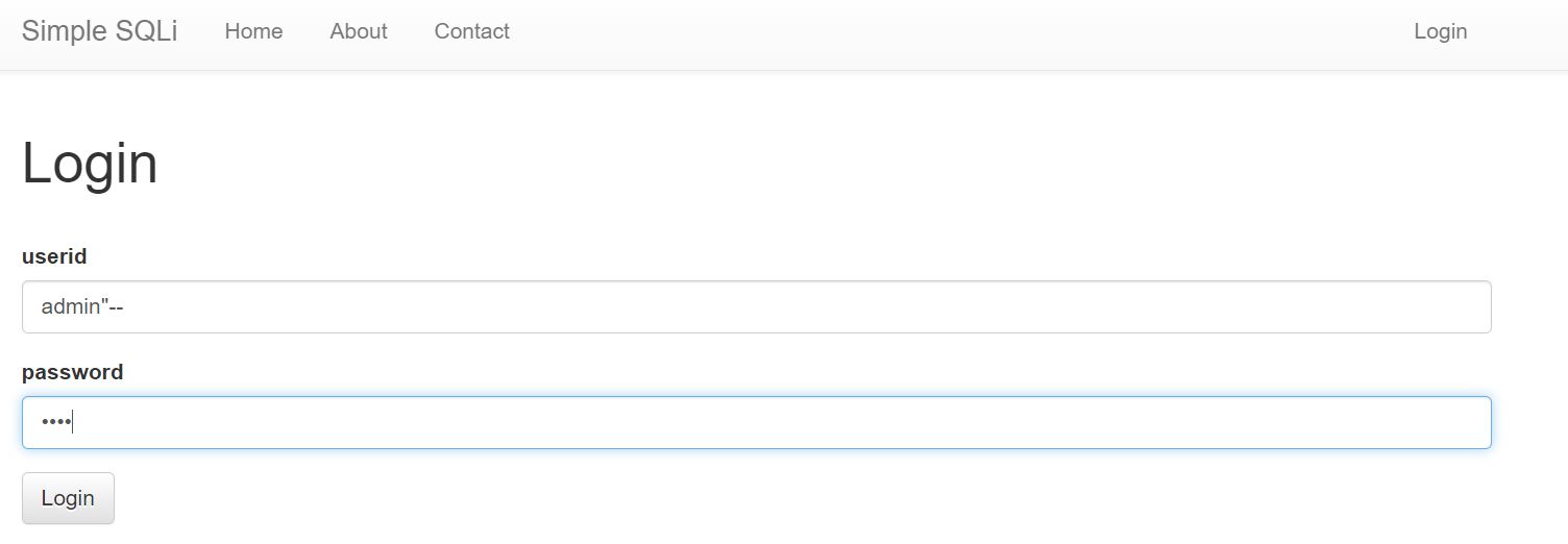 로그인 페이지로 가서 userid를 admin으로 하되 더블쿼트와 --를 써서 데이터베이스 상의 비밀번호 조건을 없애버린다.
