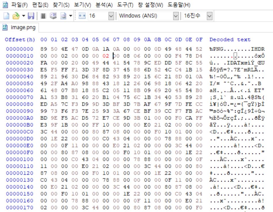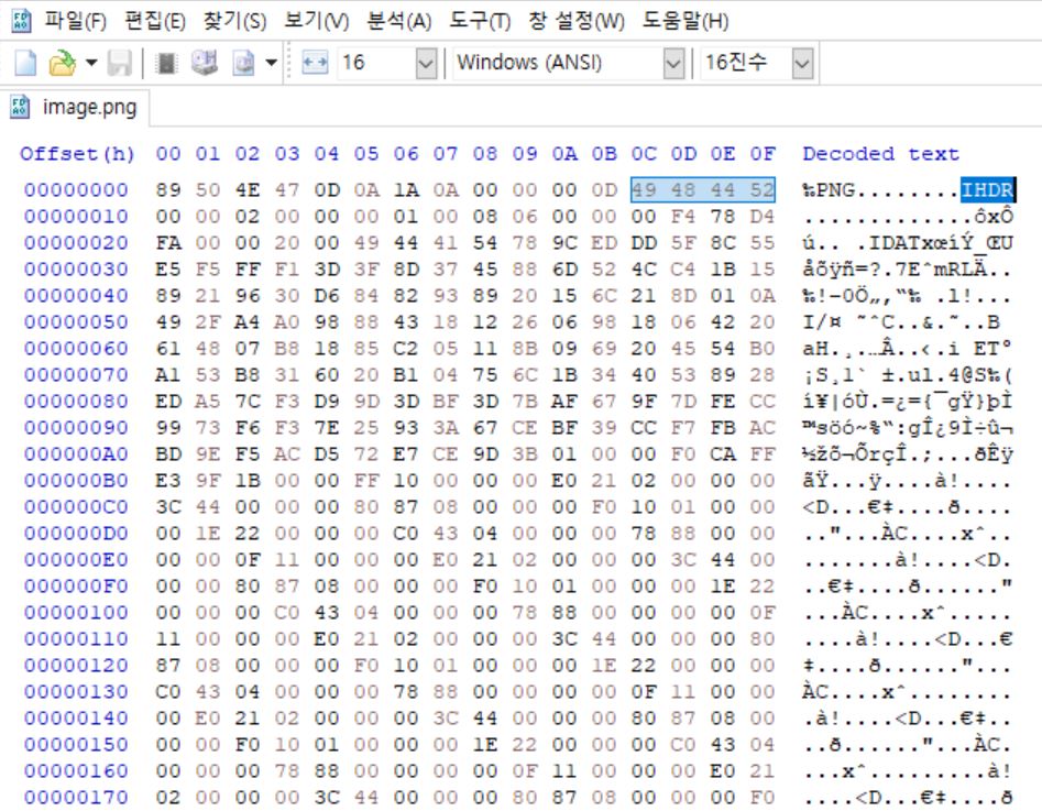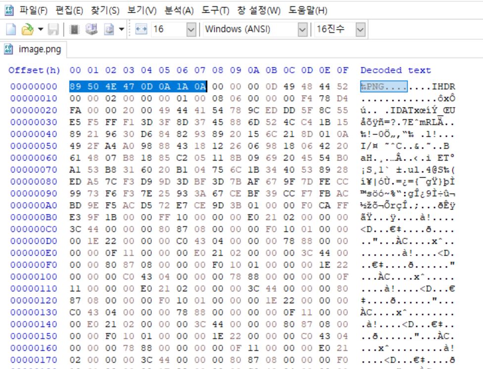 드래그 해놓은 곳이 png 파일 시그니처의 헤더 부분이다.