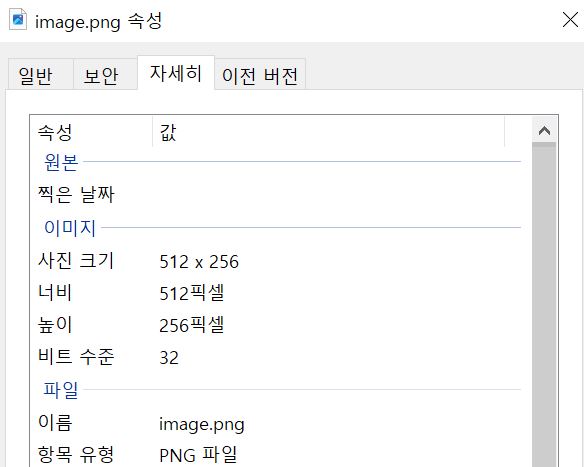 해당 이미지 파일의 속성에 들어가 보면 width가 512픽셀, height가 256픽셀임을 볼 수 있다.