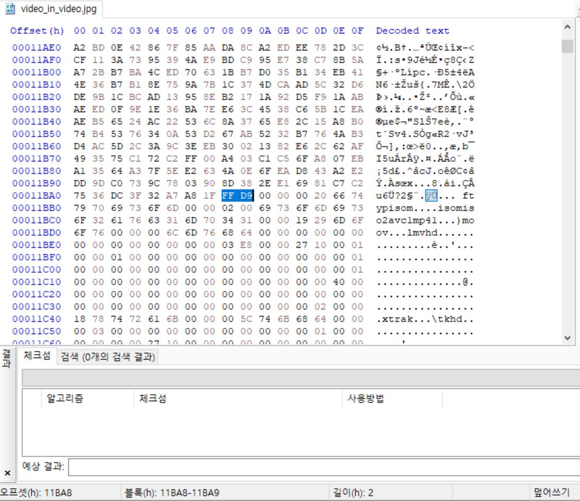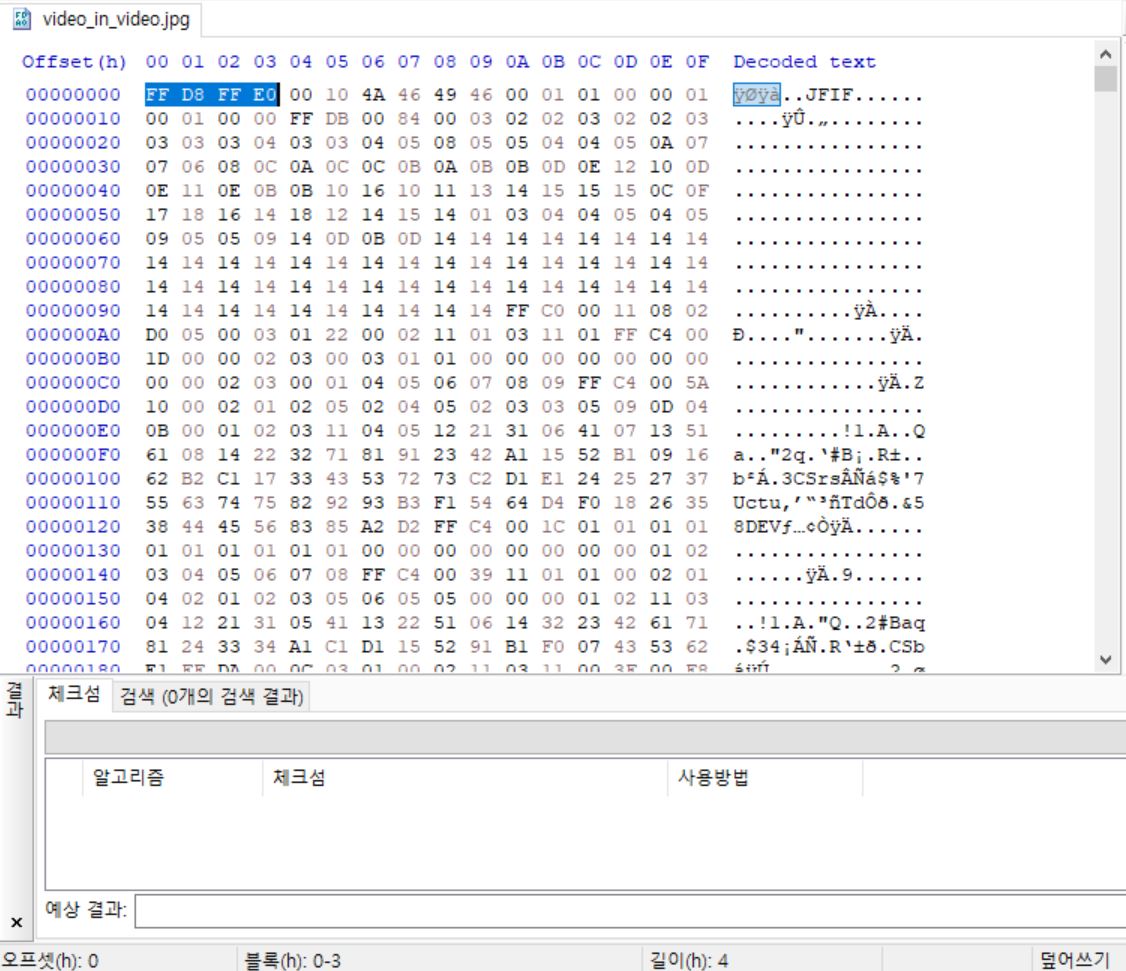 이 파일을 HxD로 열어보면 jpg 파일의 헤더 시그니처를 확인할 수 있고,
