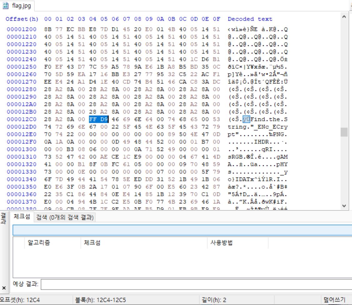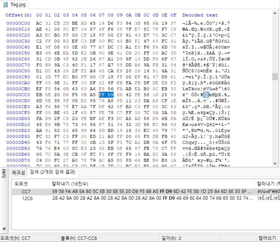 jpg의 푸터 시그니처인 FF D9를 검색하면 두 개가 나오는데 첫 번째꺼를 지우고 저장한다.