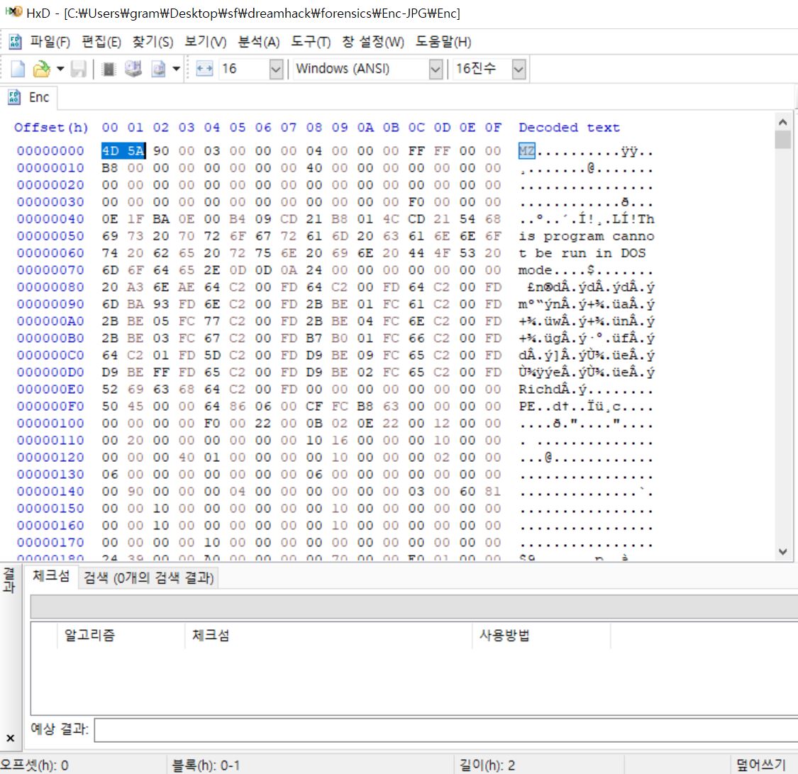 문제 파일을 다운로드 받으면 Enc라는 파일 하나와 flag.jpg 파일 하나가 있다.