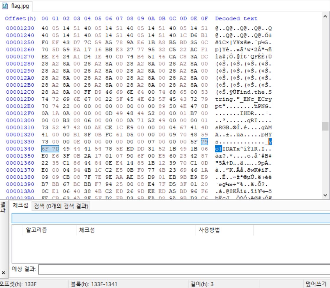 조금 내리다보면 png 시그니처가 보이면서 더 밑에는 IDAT 앞부분에 수상해 보이는 문자열이 있는 것을 발견했다.