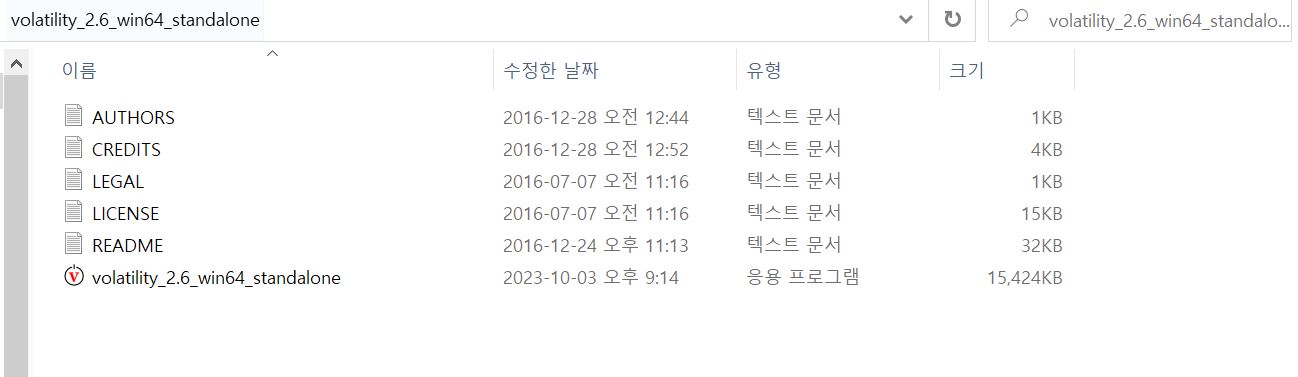Volatility는 2.6 윈도우 버전으로 다운로드 받고 바탕화면에 압축을 푼다.