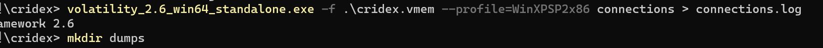 volatility_2.6_win64_standalone.exe -f .\cridex.vmem --profile=WinXPSP2x86 memdump -p 1640 -D .\dumps\ 도 바로 입력해준다.