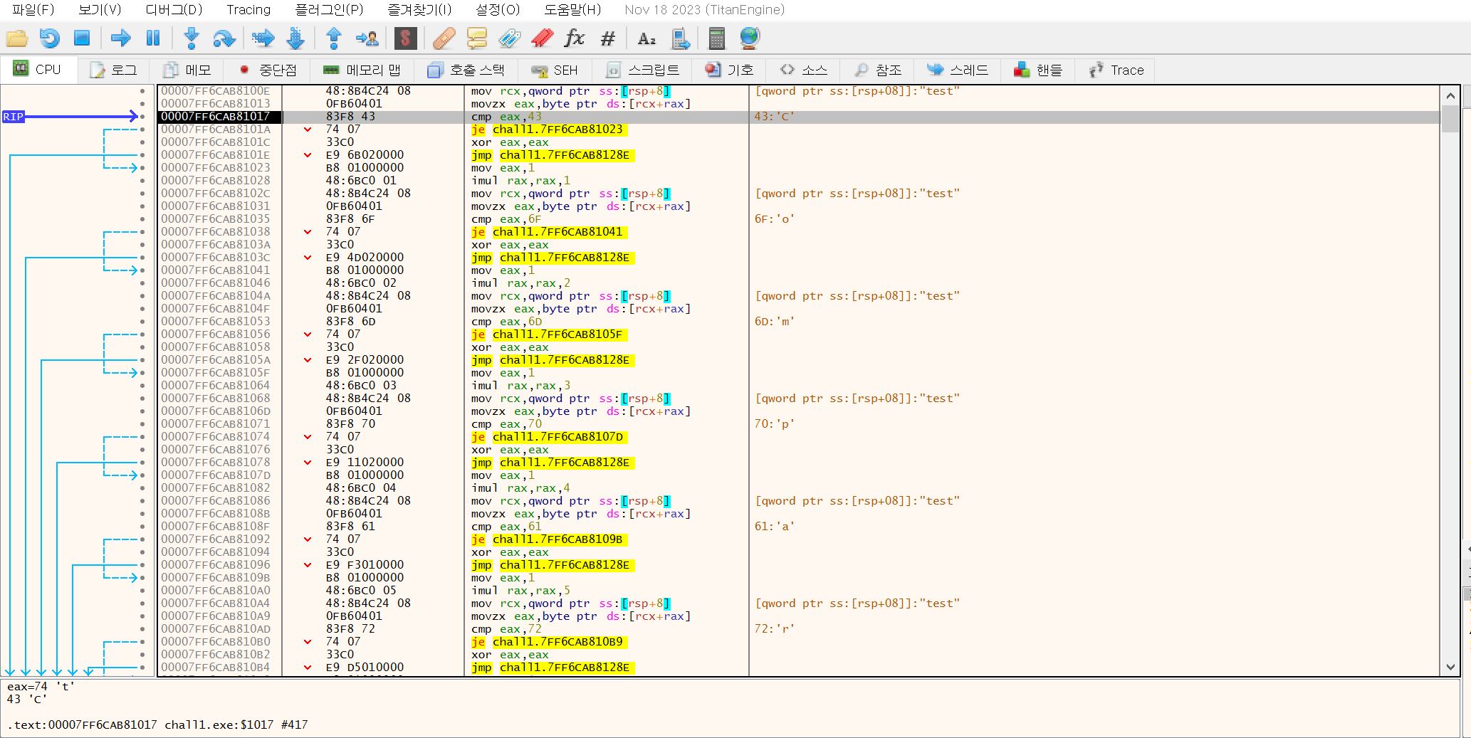 그런데 마찬가지로 f7로 얼마 실행시키지 않았는데 정답이 문자 하나씩 다 나오고 있다.