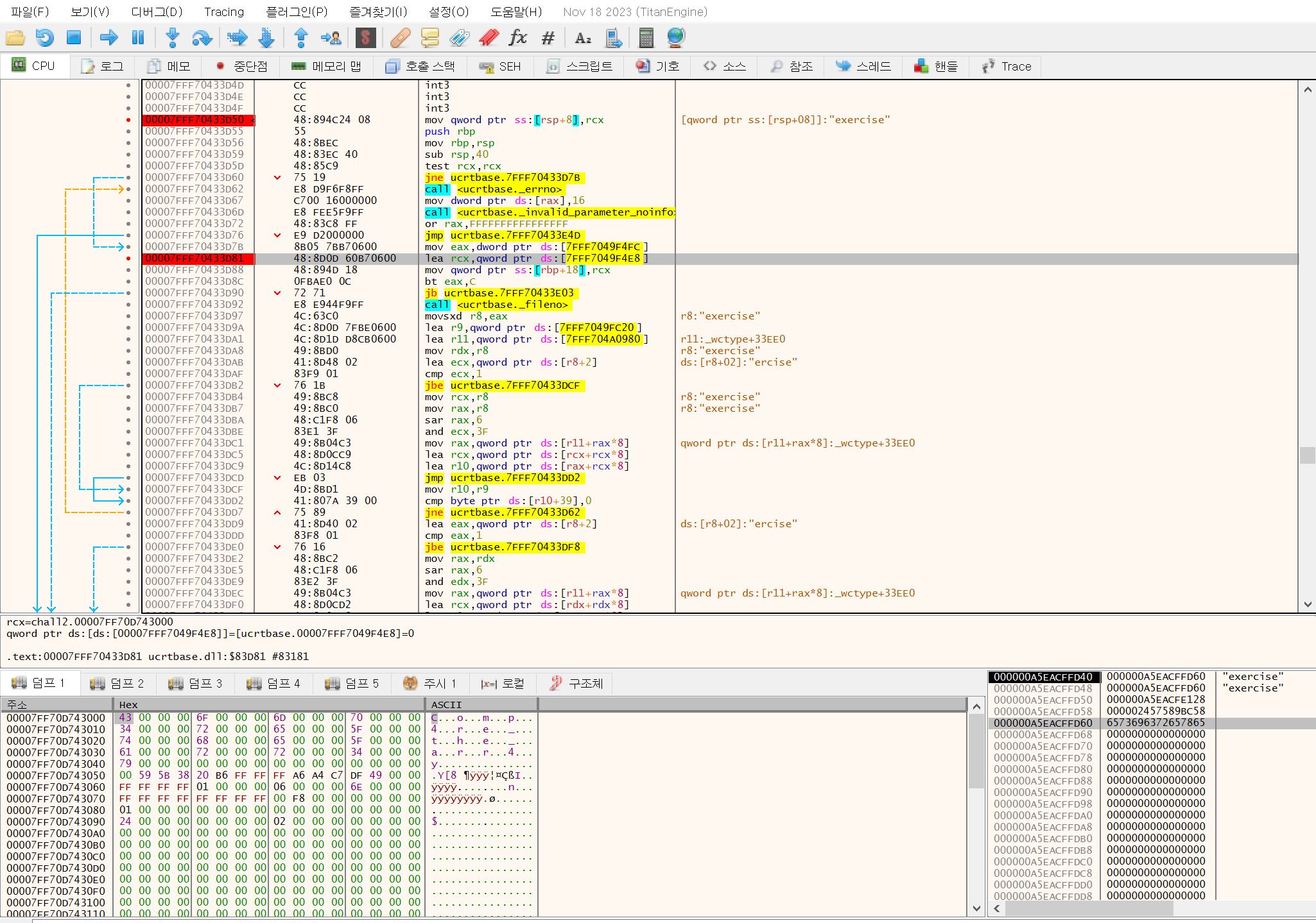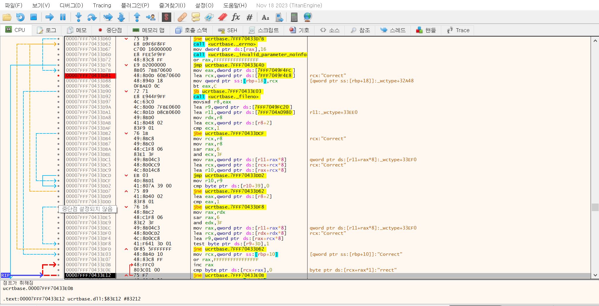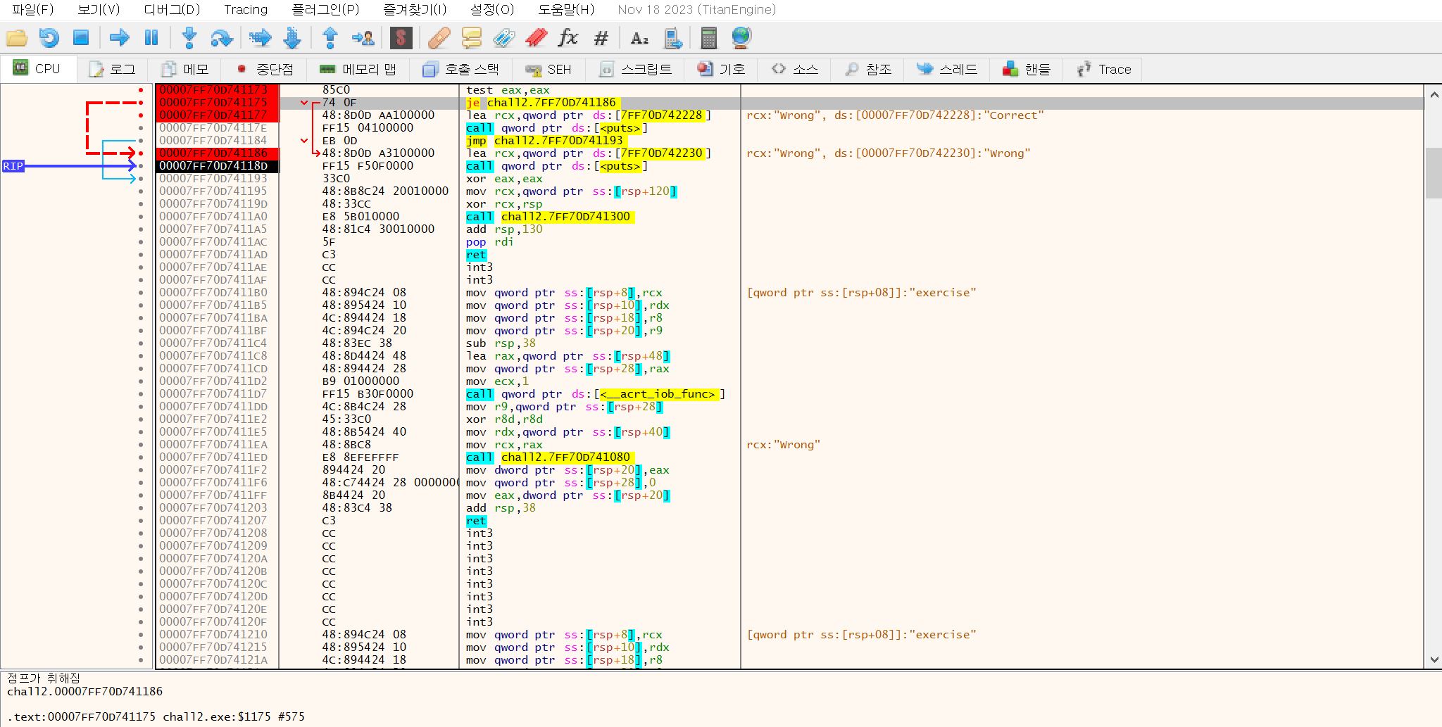 일단 x64dbg에서 테스트겸 "exercise"를 입력하고 중단점 필요한 곳에 걸고 f8로 따라가다보면 Correct와 Wrong을 출력하는 부분이 위와 같이 나온다.