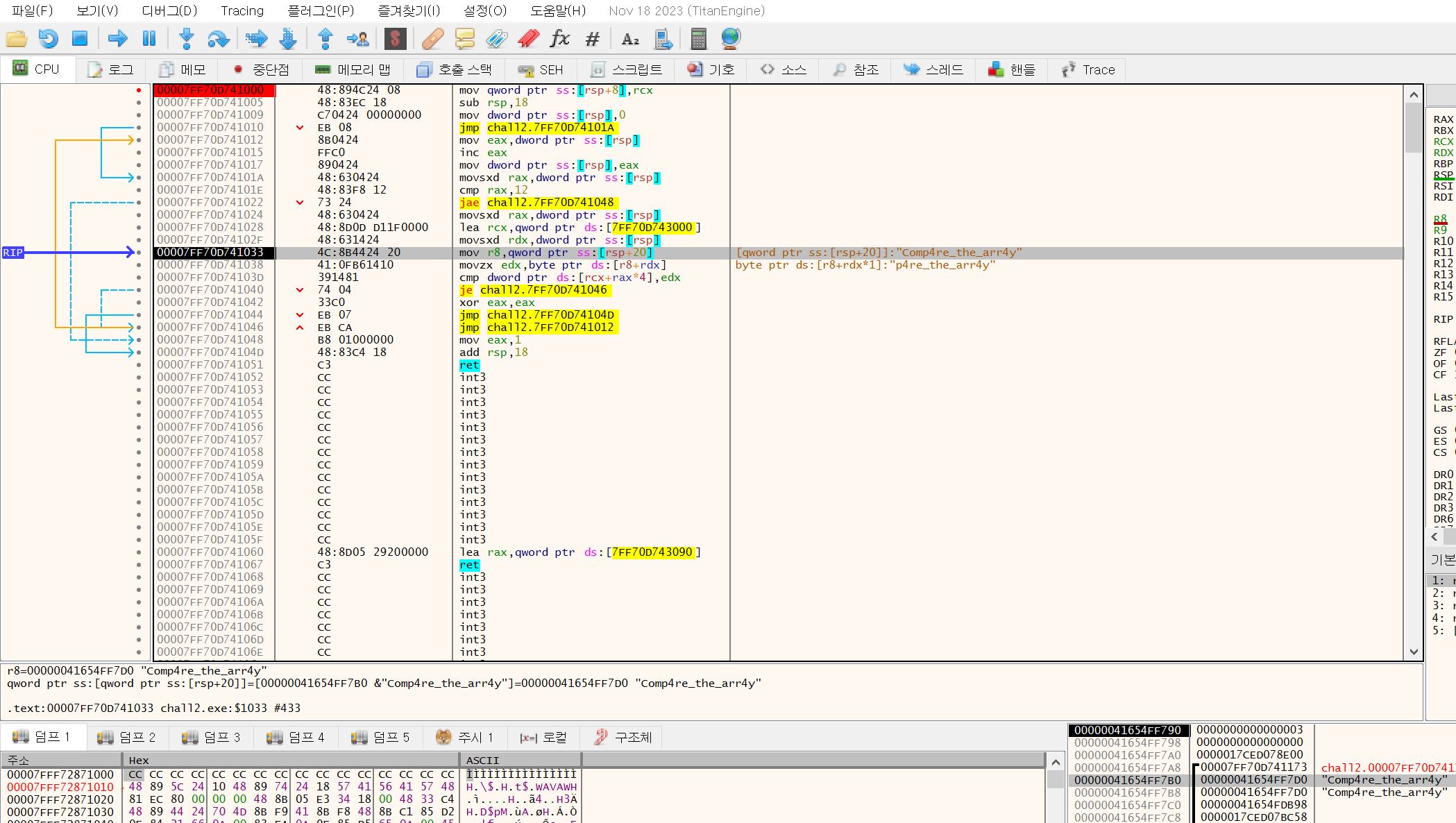 플래그값을 알았으니, 맞는지 확인하기 위해 새로 실행해서 정답을 입력해주고 f7로 하나씩 실행시켜보면 위와 같이 문자 하나하나 비교하는 걸 볼 수 있다.