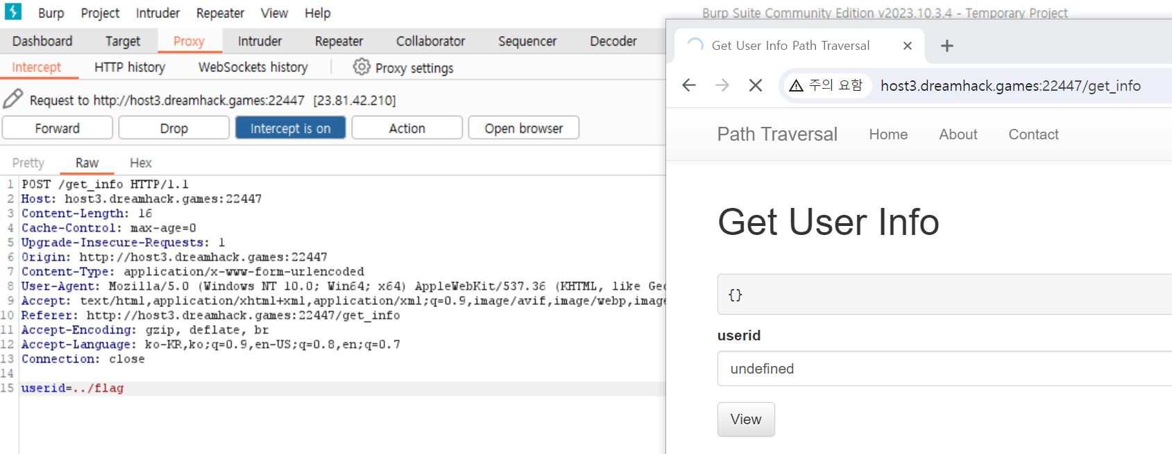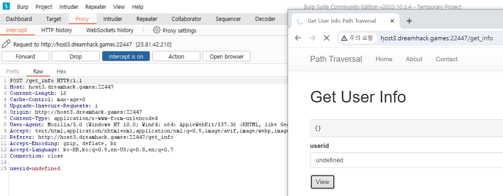 그래서 일단 BurpSuite을 켜서 프록시 탭의 intercept에서 open browser로 문제 환경에 접속하고, intercept를 on으로 킨다. 그다음 다시 ../flag를 입력하고 View를 누르면 위 캡처사진과 같이 userid=undefined로 되어 있는 걸 볼 수 있다.