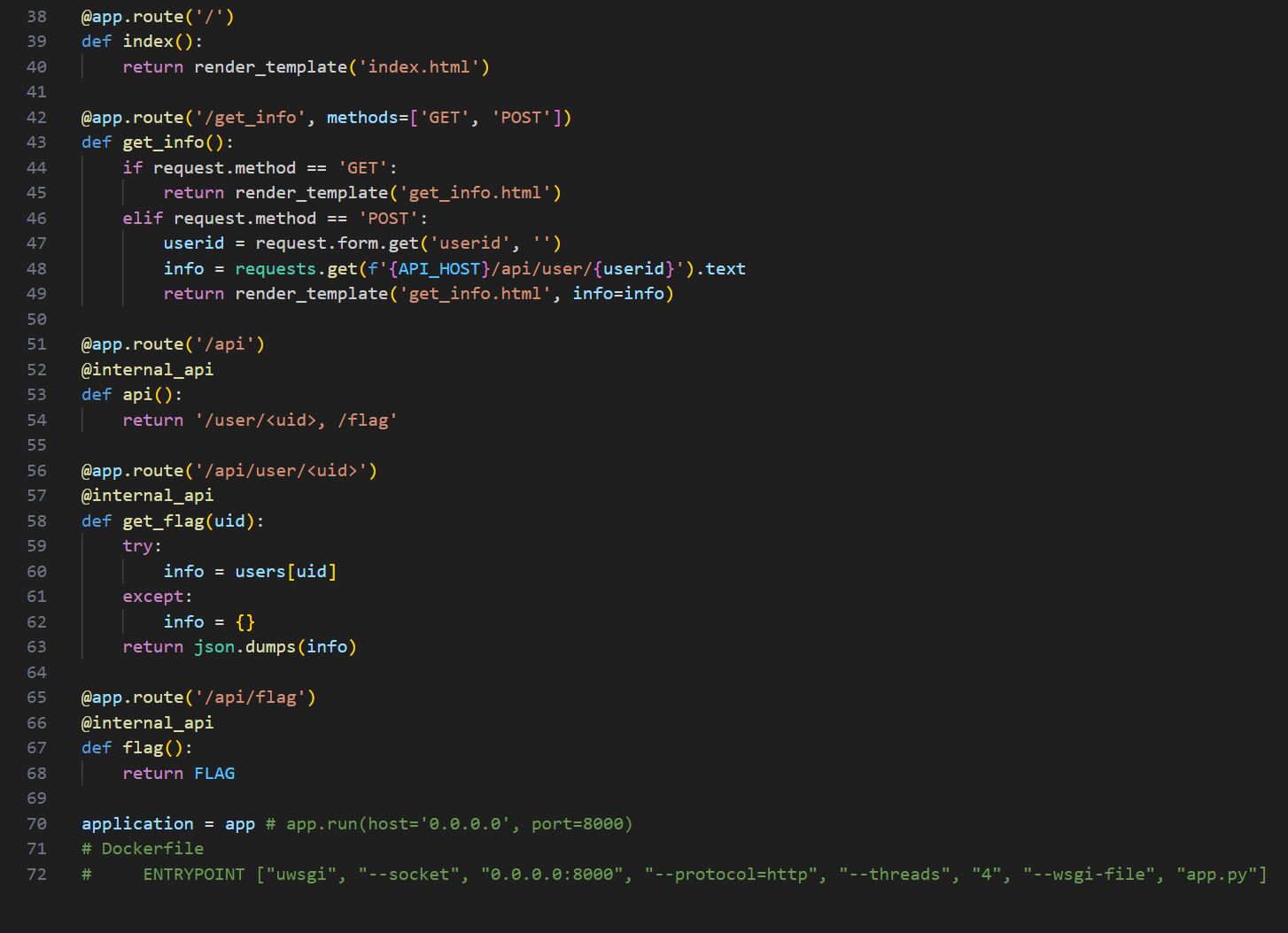 그리고 /get_info에서 /api/user/<uid>일 때 상위 디렉토리로 한번 이동해서 /api/flag 경로를 가야하니까 ..flag를 입력해봤는데, 마찬가지로 플래그값을 볼 수 없다.