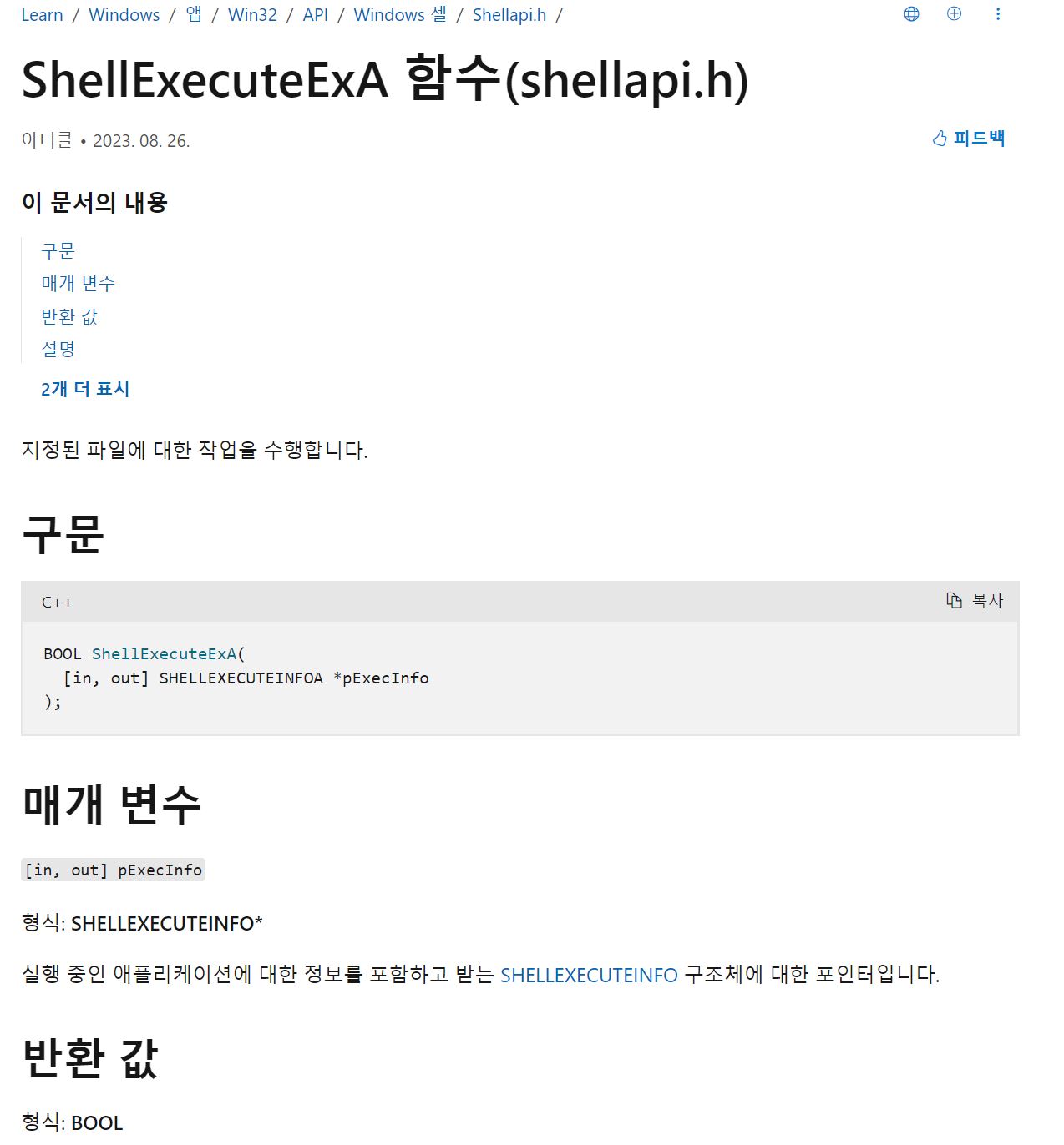 위와 같이 msdn에 ShellExecuteExA()에 대한 친절한 설명이 나와있다.