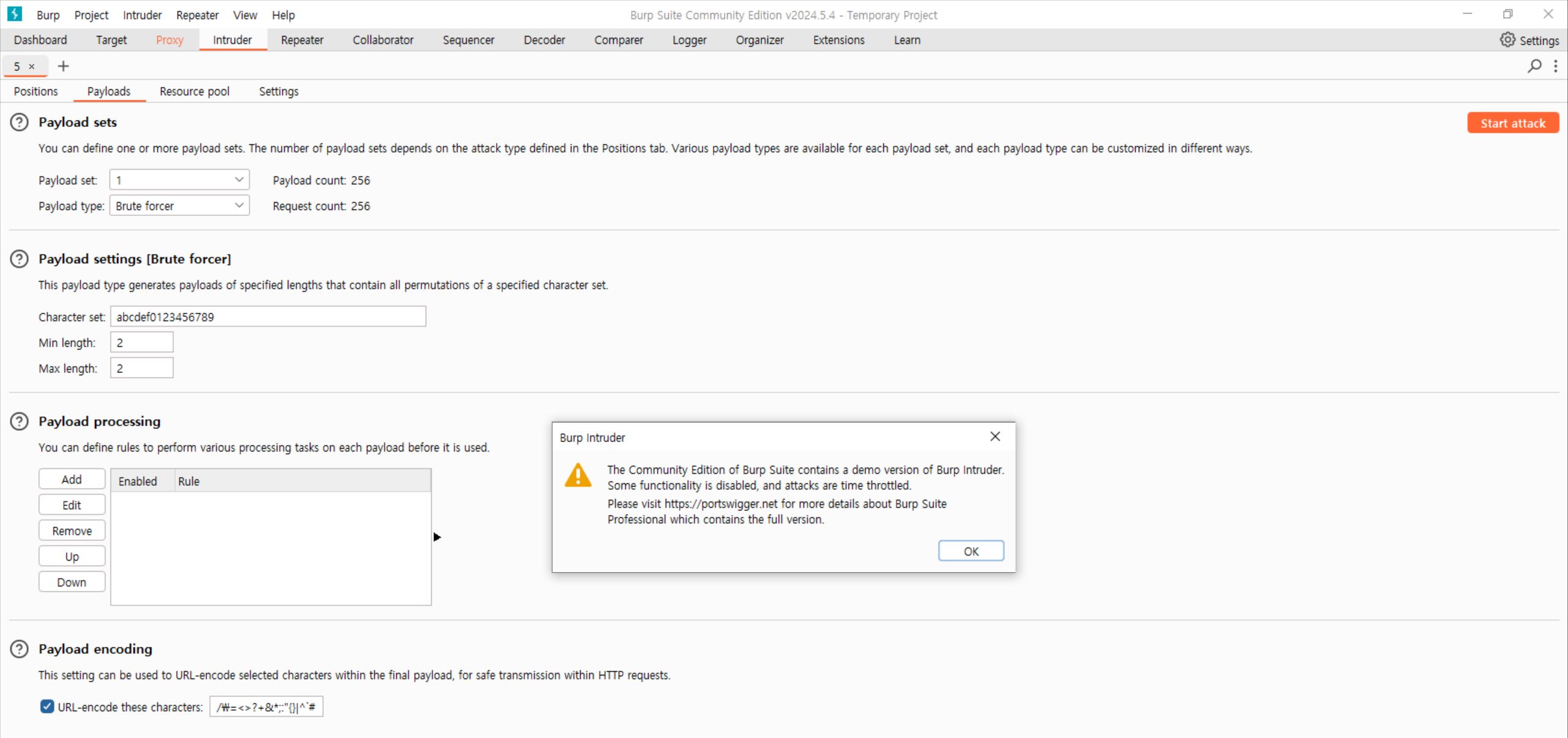 payloads 부분에서는 type을 Brute forcer로 바꿔주고, Character set은 16진수 범위인 abcdef0123456789를 입력한다.