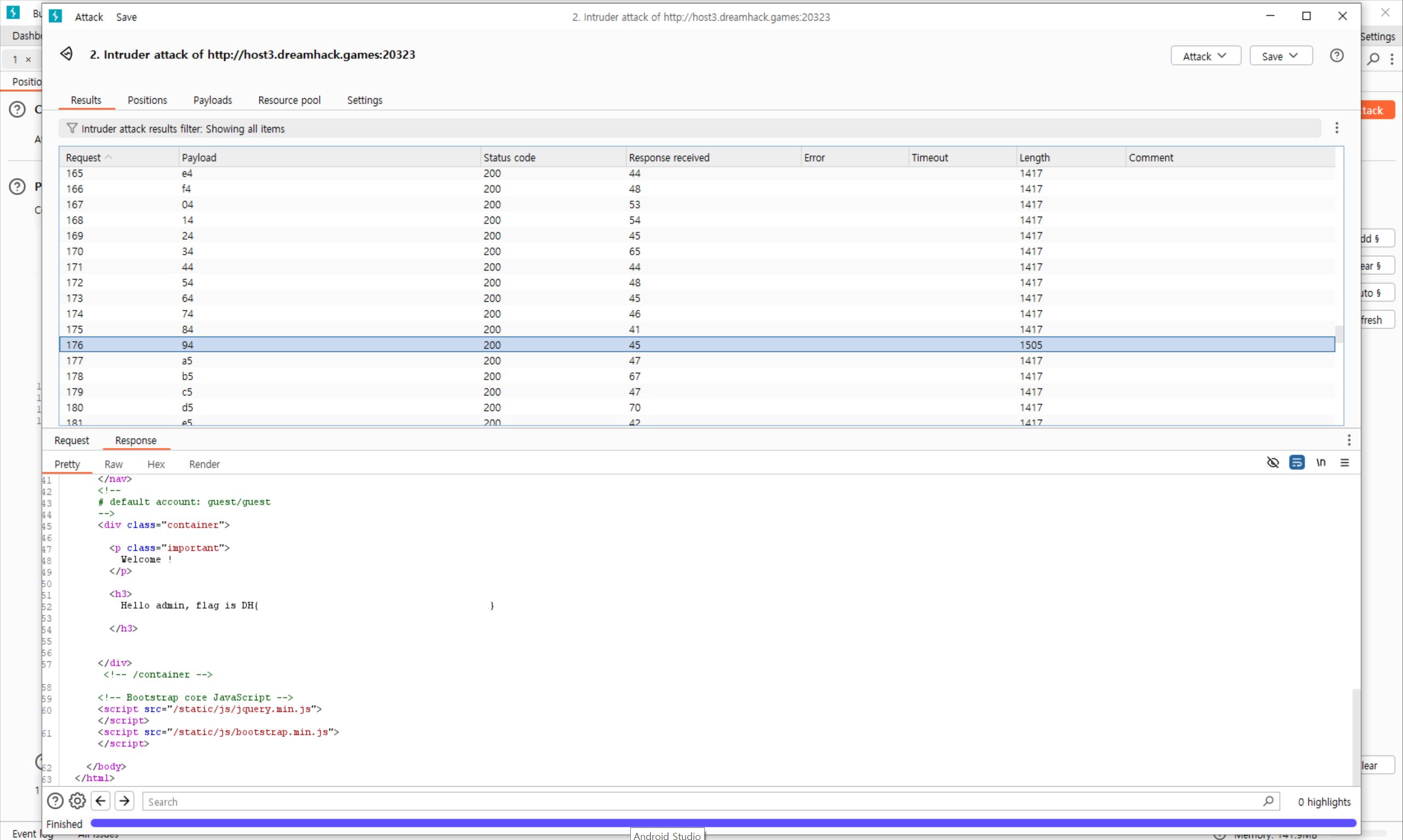 response의 length가 1505인 부분이 등장했다. response 데이터에 플래그값이 함께 담겨있기 때문이다. 이를 더블클릭해서 response탭을 누르면 위와 같이 DH{} 형식의 플래그값을 볼 수 있다.