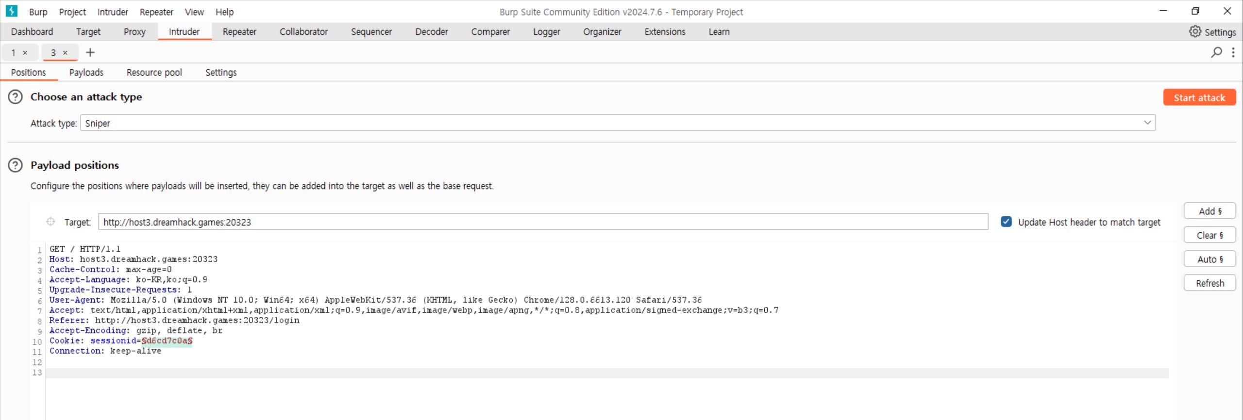 여기서 sessionid 부분(브루트포싱할 타겟)을 드래그한 뒤 옆에 Add$를 눌러준다.